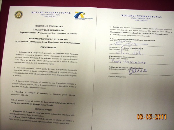 Alla conferenza organizzata dal Rotary Club Gallipoli e in particolare dal Comitato presieduto dal socio Dott. Giacinto Pettinati di concerto con il Distretto 2120, hanno partecipato il Governatore del Distretto 2120 Dott. Marco Torsello, il Presidente del Rotary Club Gallipoli Dott. Tommaso De Vittorio, l'Assessore alla Sanità della Regione Puglia Prof. Tommaso Fiore, il Commissario Straordinario ASL di Lecce Dott.ssa Paola Ciannamea, il Prof. Francesco Selvaggi dell'Università Federico II di Napoli, la relatrice Dott.ssa Santa Fizzarotti, specialista in Psicologia Clinica, il Primario del reparto di Rianimazione Dott. Antonio Libetta, il Sen. Dott. Rosario Giorgio Costa, i coordinatori della sottocommissione distrettuale sulla donazione degli organi PDG Prof. Tommaso Berardi e Vito Scarola, il Segretario collaboratore distrettuale Lino Pignataro, il Presidente del Rotary Club Lecce Sud Pasquale Prisco, i soci del club, il personale medico della struttura ospedaliera ed altri. Nel corso della conferenza è stato stipulato un protocollo di intesa tra il Rotary Club Gallipoli e l'Ospedale di Casarano. Al termine è stata inaugurata la Sala di accoglienza donata dal Rotary Club Gallipoli al Reparto di Rianimazione, destinata al colloquio con i familiari dei potenziali donatori di organi.